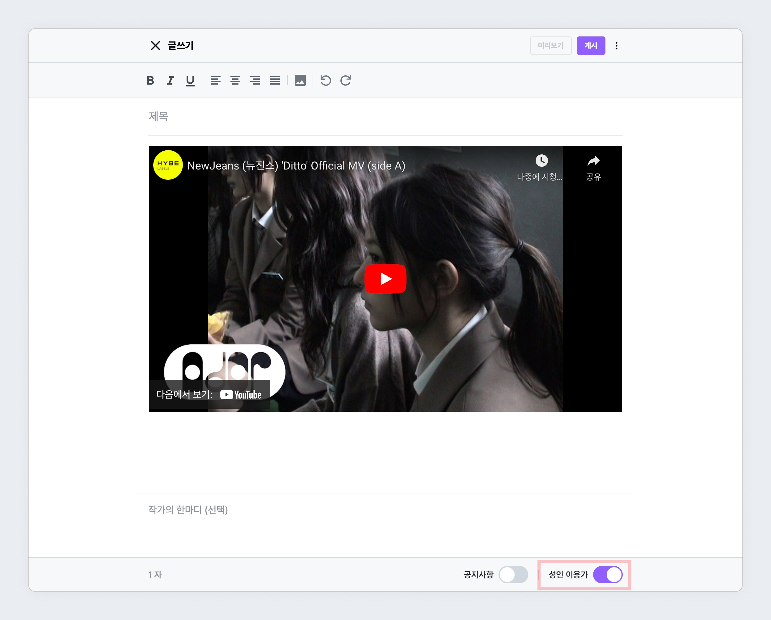 에디터 > 유튜브 영상 첨부 디리토 2024년 01월 18일 08:08 유튜브에서 공유 버튼을 눌러 링크를 복사한 후, 바로 에디터에 붙여넣기를 하면 회차에 유튜브 영상을 첨부할 수 있어요. 관련 문서 에디터 > 미리보기 작품 정보 > 출판사 계약 의지 밝히기 작품 정보 > 디리토 ONLY 에디터 > 성인 이용가 회차 설정 새 작품 > 표지