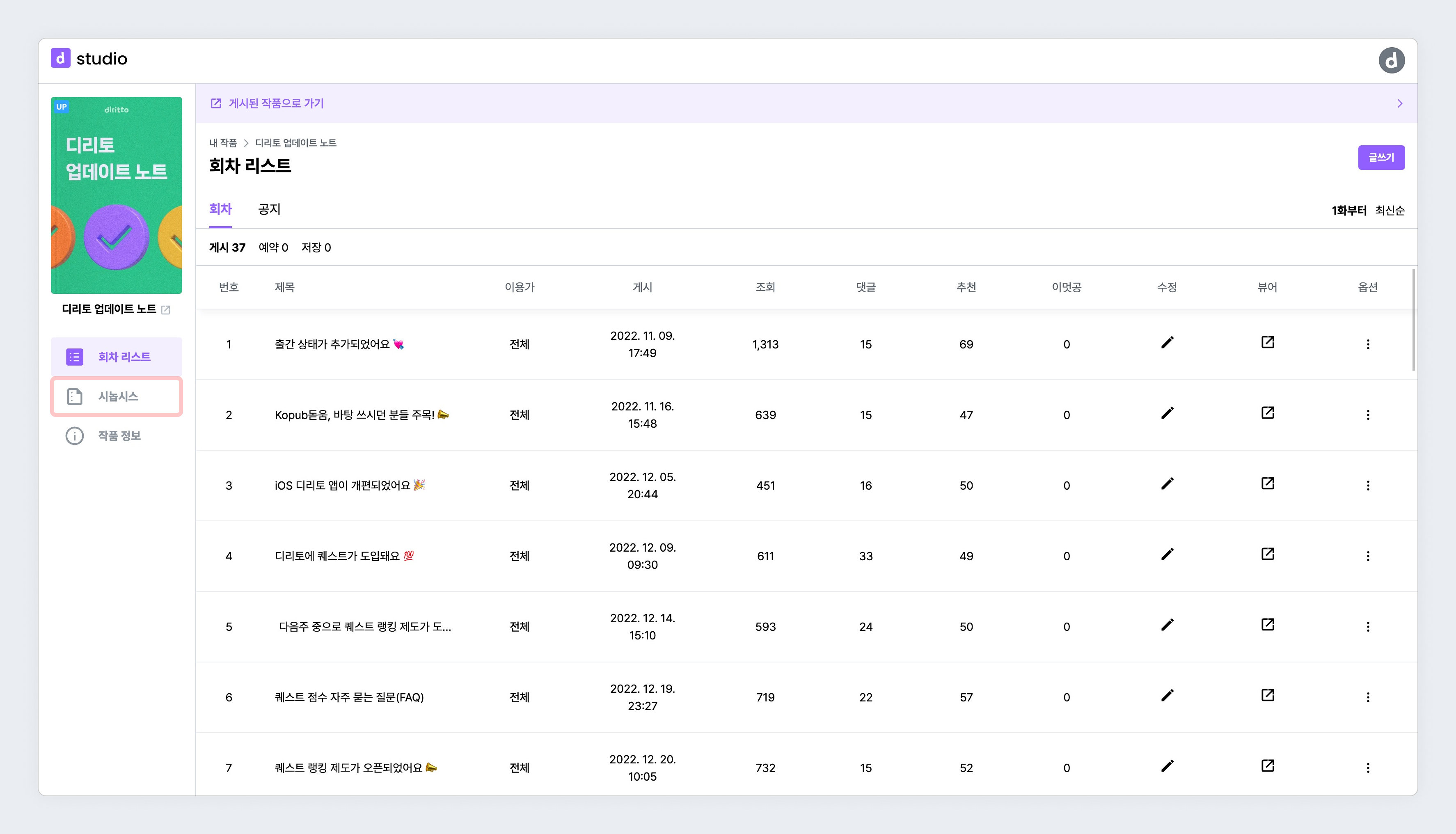 작품 관리 > 시놉시스 디리토 2024년 01월 18일 08:17 작품의 기승전결 시놉시스를 입력해봐요. 시놉시스 입력하러 가기 왼쪽 사이드 메뉴에서 시놉시스 메뉴를 눌러주세요. 관련 문서 작품 정보 > 출판사 계약 의지 밝히기 작품 정보 > 디리토 ONLY 작품 정보 새 작품 작품 > 마케팅 활용 동의 새 작품 > 작품 상태